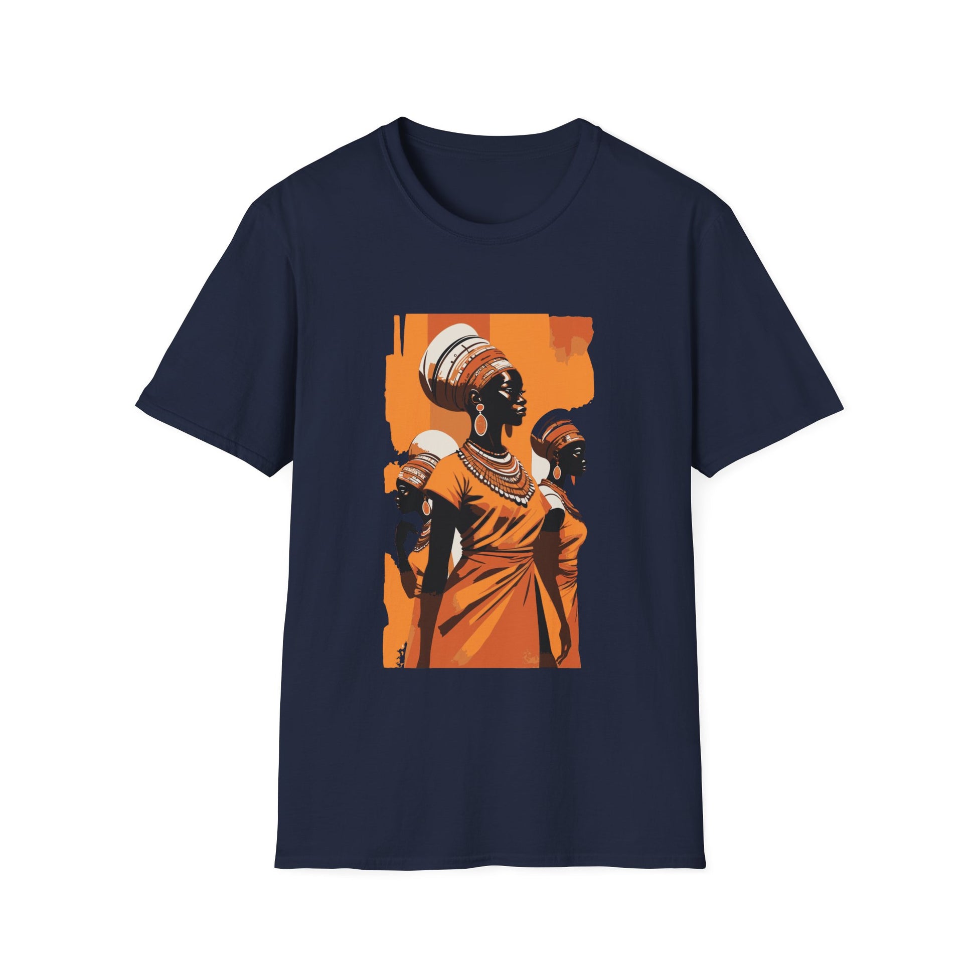 Three women move like a chorus of grace—heads wrapped, jewelry singing, eyes set on a horizon they already own. Warm oranges and deep shadows turn poise into presence, heritage into a modern anthem.