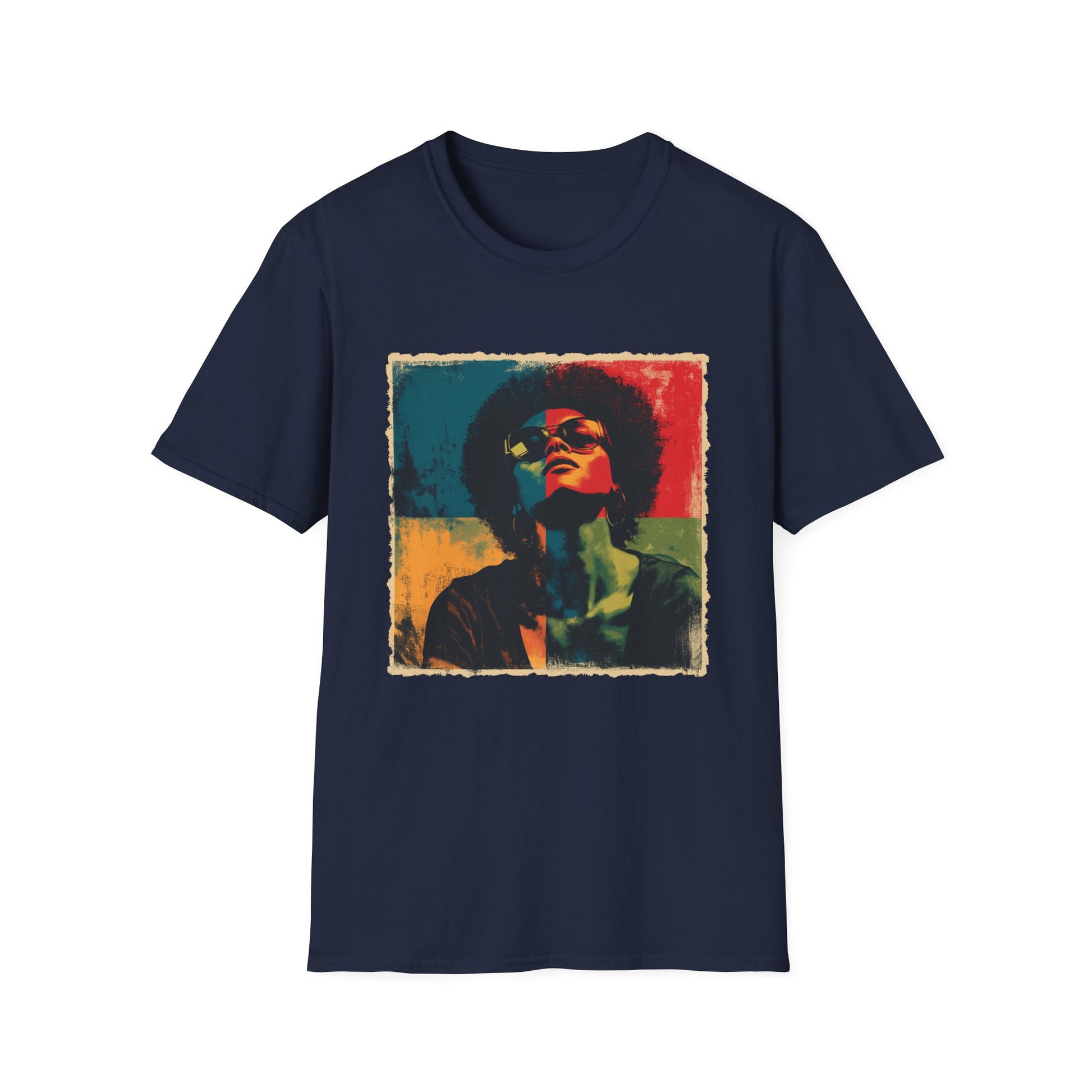 Four bold color blocks, one fearless mood. This retro portrait turns sunglasses and curls into pure attitude—grunge edges, gallery energy, instant statement. It pairs with denim, leather or a clean blazer and looks just as strong on posters and totes.