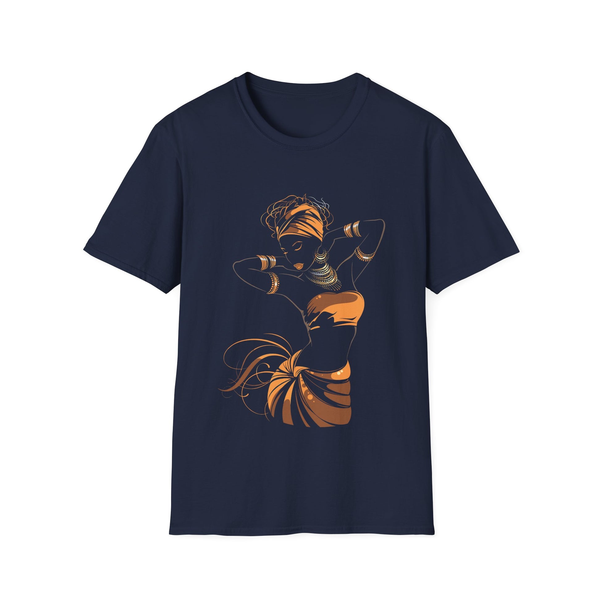 Movement becomes jewelry: a headwrap flows, bangles sparkle and warm copper lines sketch a dancer mid-pose. Minimal detail, maximum presence—heritage and elegance captured in a single sweep of gold.