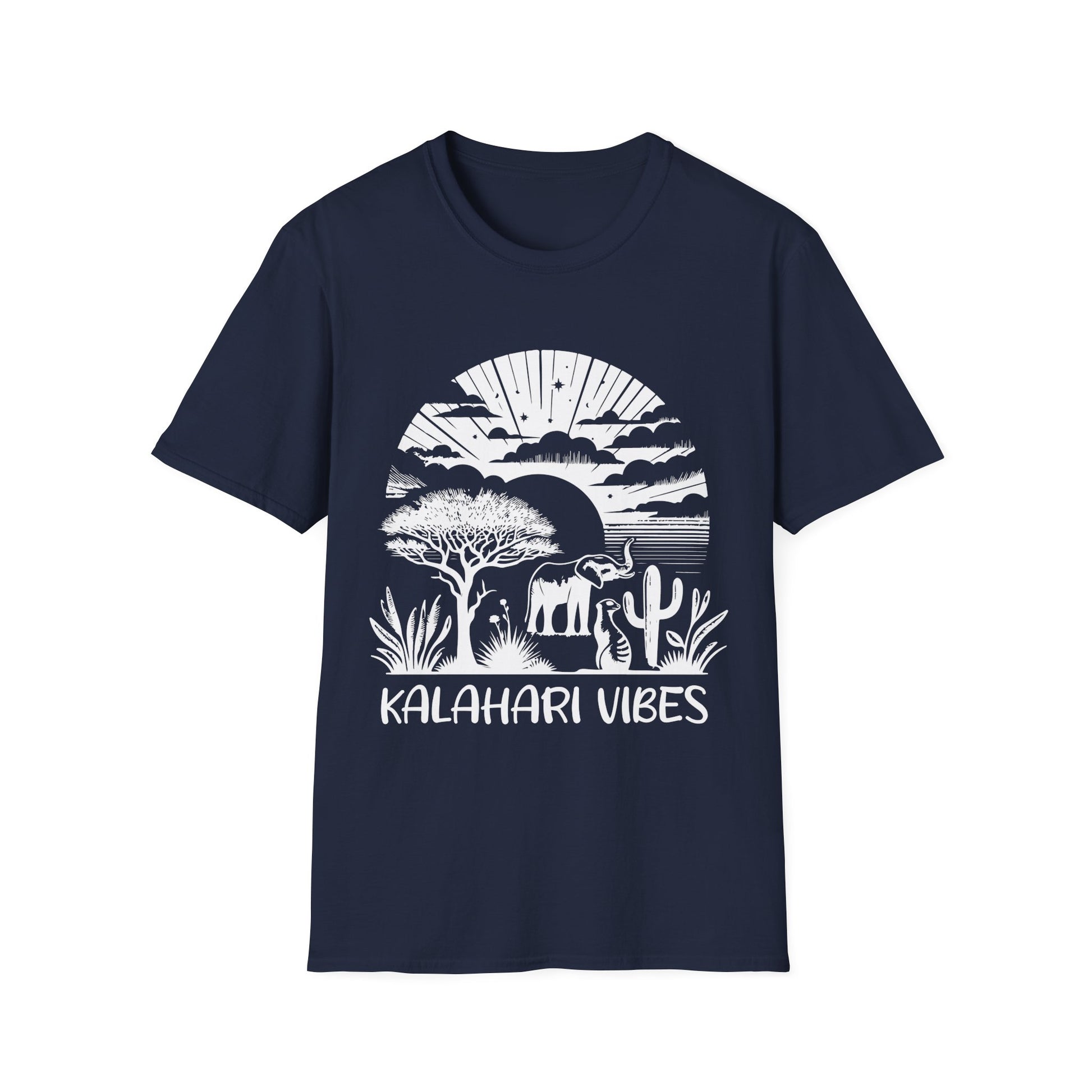 A wide desert sky, stars breaking through the dusk, and an elephant standing calm beside a curious meerkat—this monochrome scene bottles the hush of the Kalahari at golden hour. Clean lines and a bold arch make it a wearable postcard from Southern Africa.
