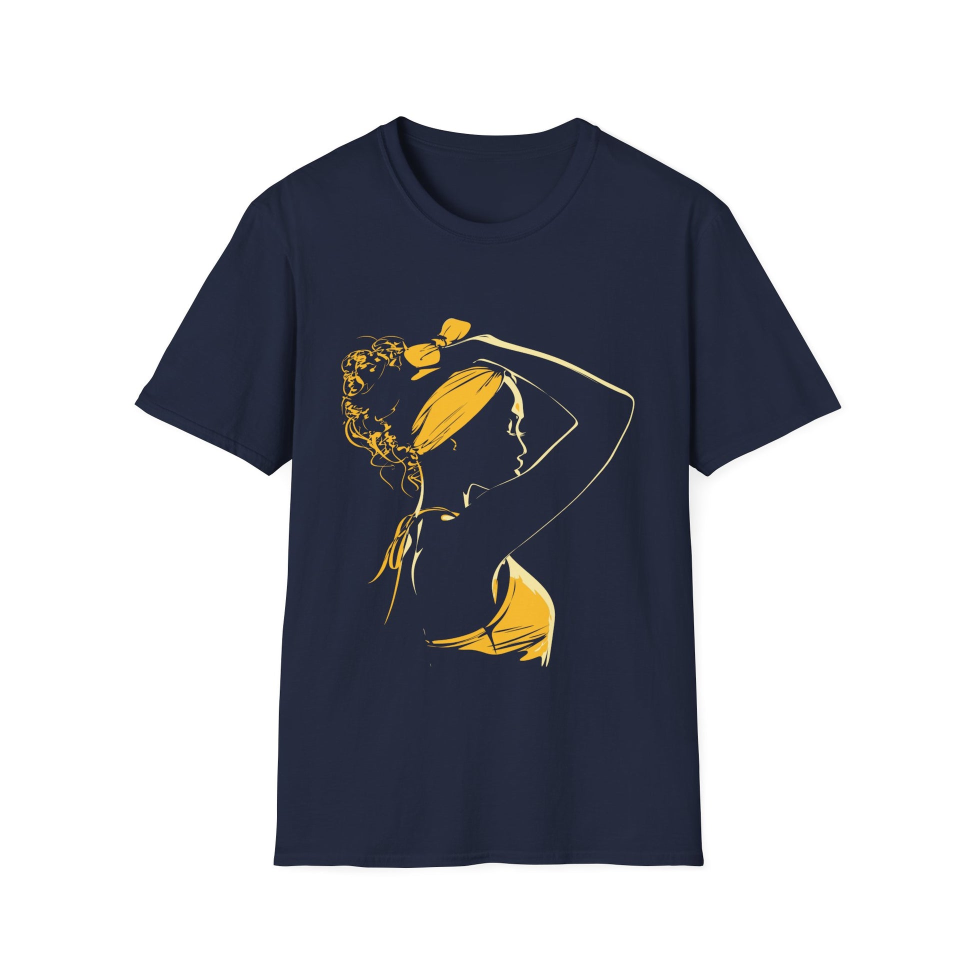 A single sweep of gold turns posture into poetry—hair tied, chin lifted, light tracing every curve. Minimal lines carry maximum elegance, giving you a wearable piece of gallery art with luxe, golden-hour calm.